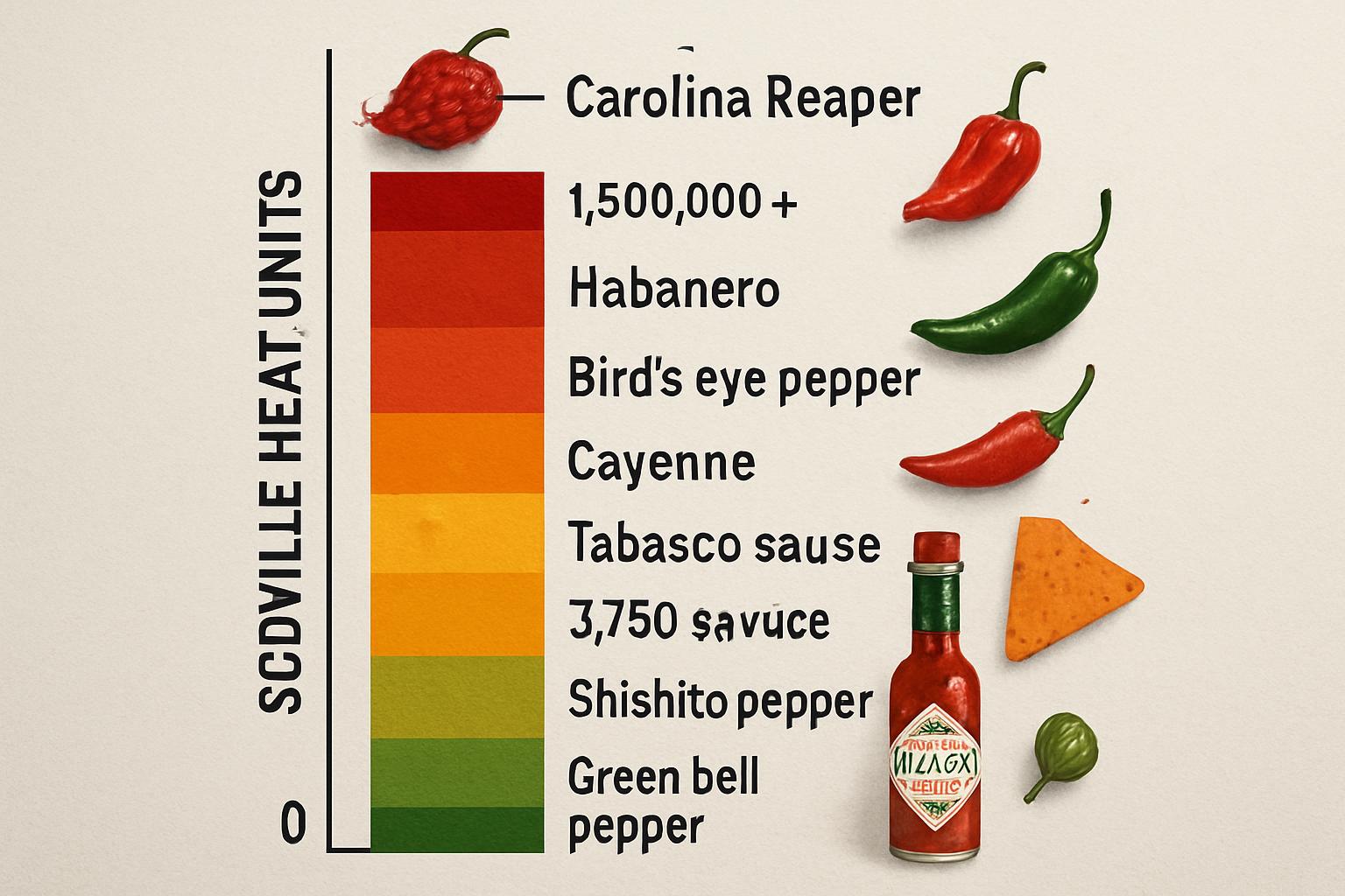 スコヴィル値の「どのくらい?」が一目でわかる早見と、タバスコや中辛カレーなど身近な辛さレベルの目安、測定方法・カプサイシンの基礎、ギネス世界記録級(キャロライナ・リーパー)や日本で人気の激辛ラーメン/デスソース/スナックまでの最強ランキング、安全に楽しむコツを網羅。